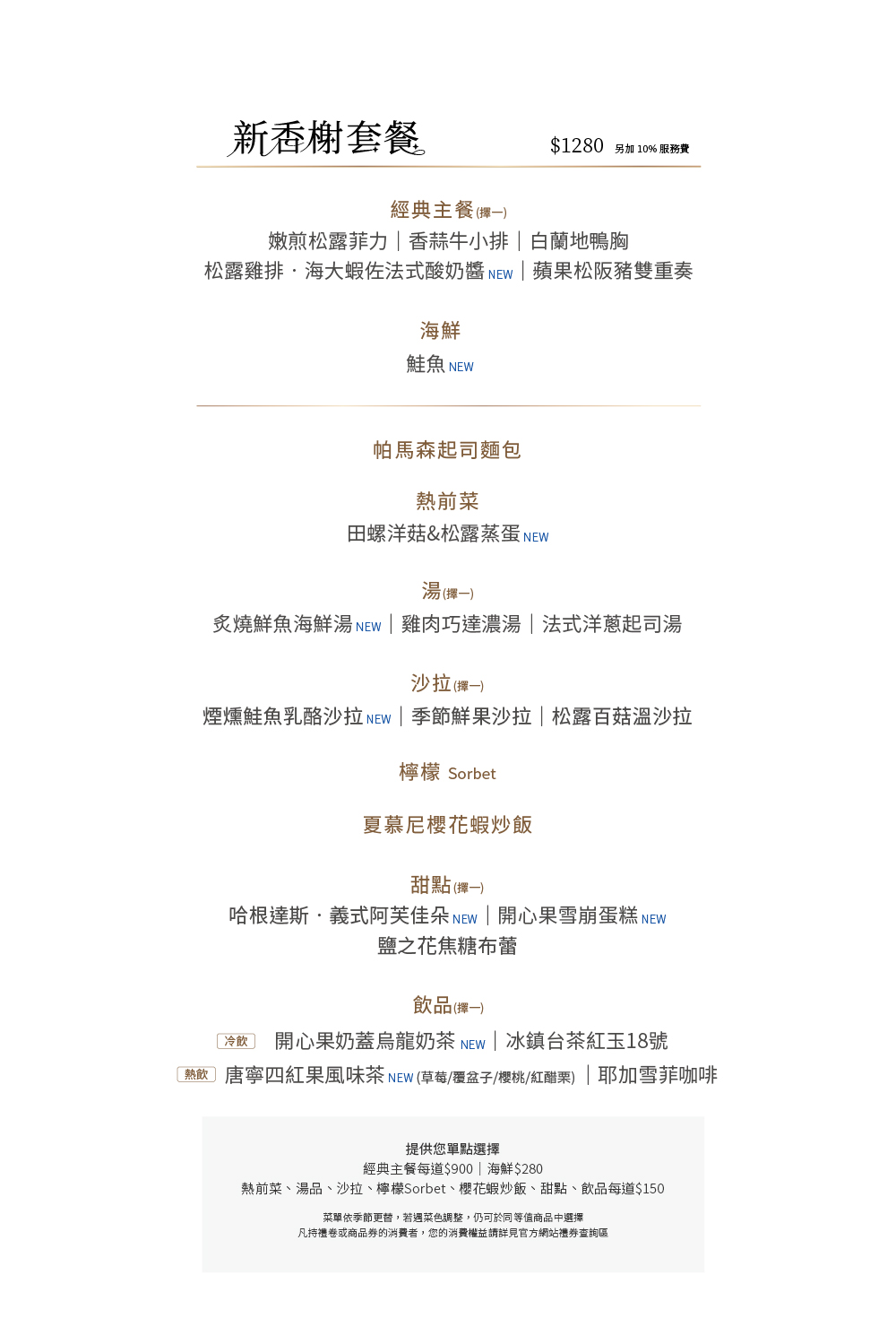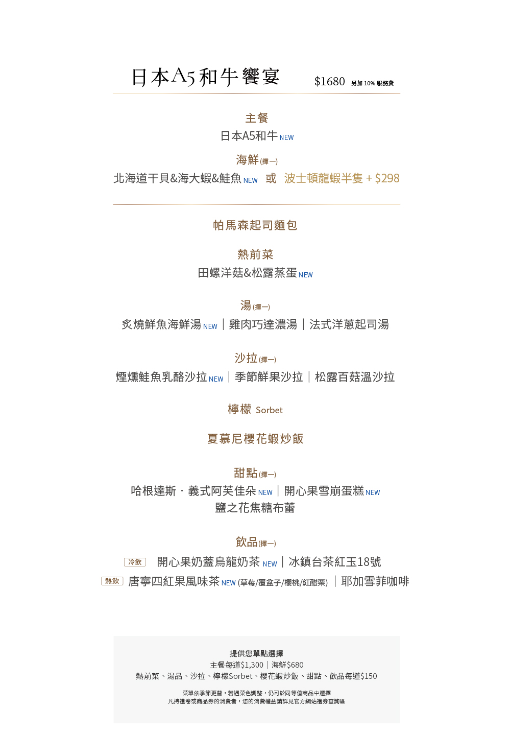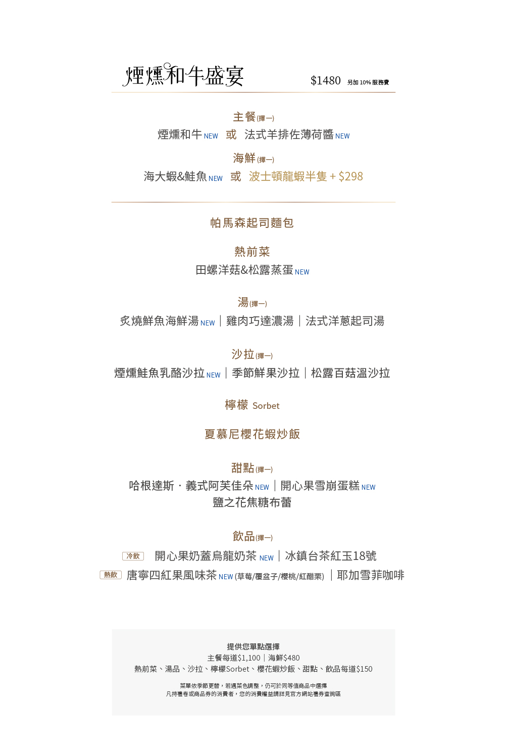 |本餐廳得依季節更替調整菜單內容。如遇菜色內容調整,仍可於同等值商品中選擇。