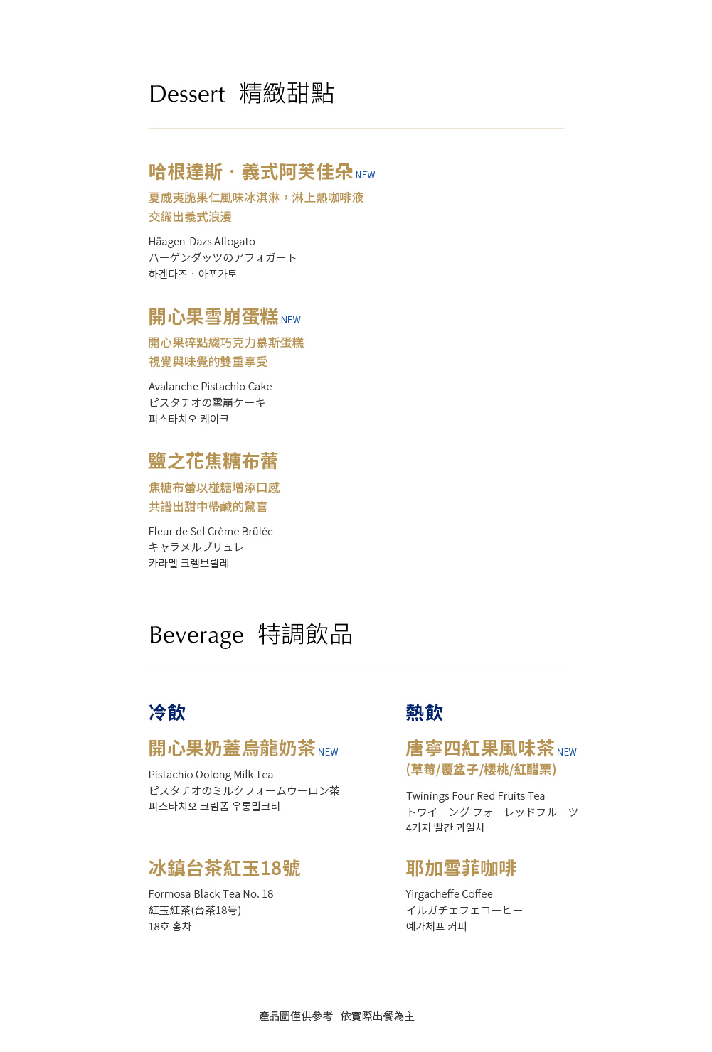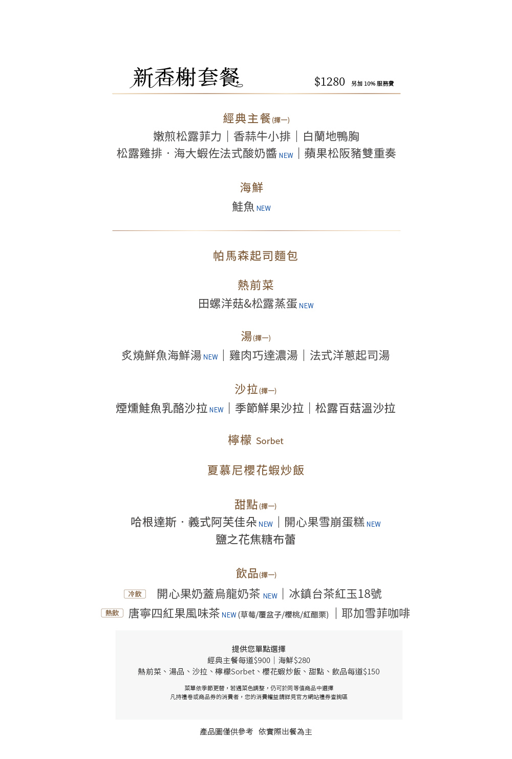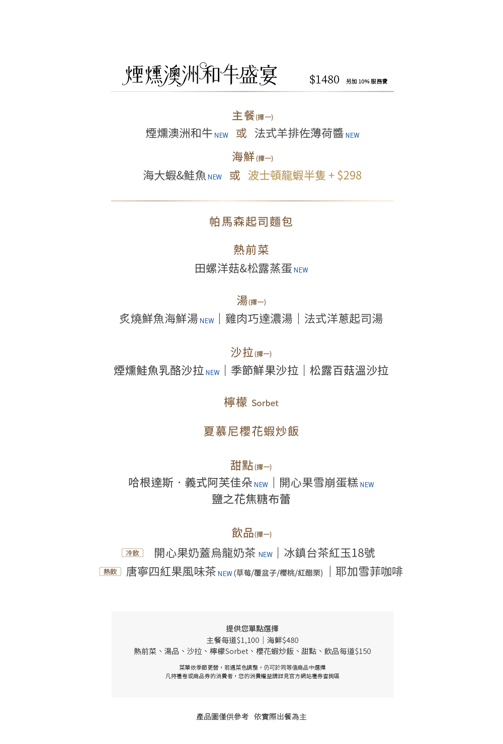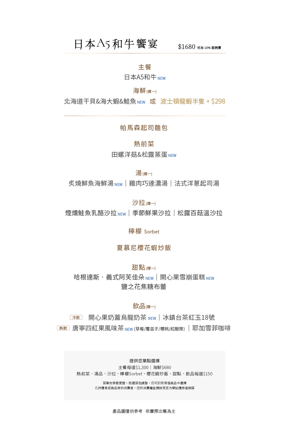 |本餐廳得依季節更替調整菜單內容。如遇菜色內容調整,仍可於同等值商品中選擇。